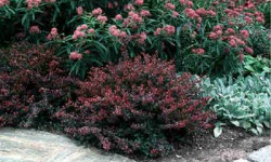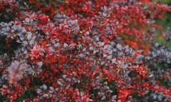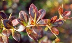 Osiąga zaledwie 1 m wysokości. Liście brązowo czerwone, jesienią
