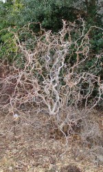Duży, gęsty krzew z parasolowatą koroną. Gałęzie ma mocno skręcone